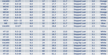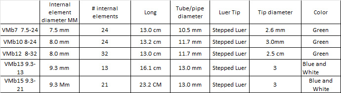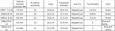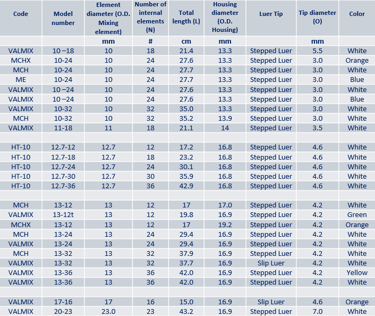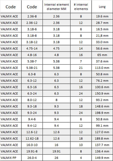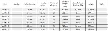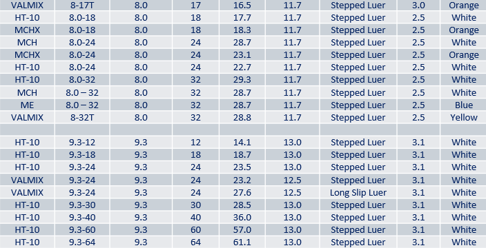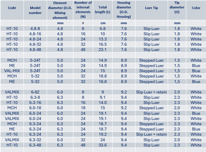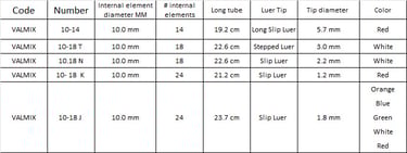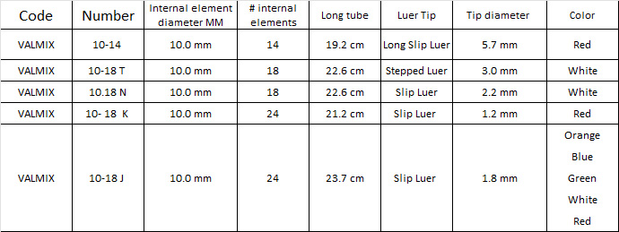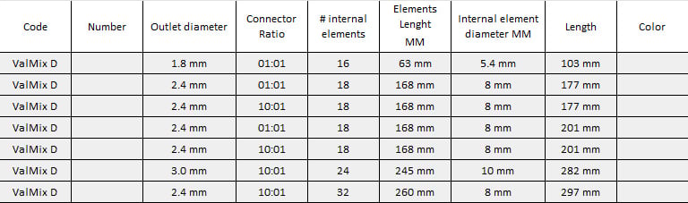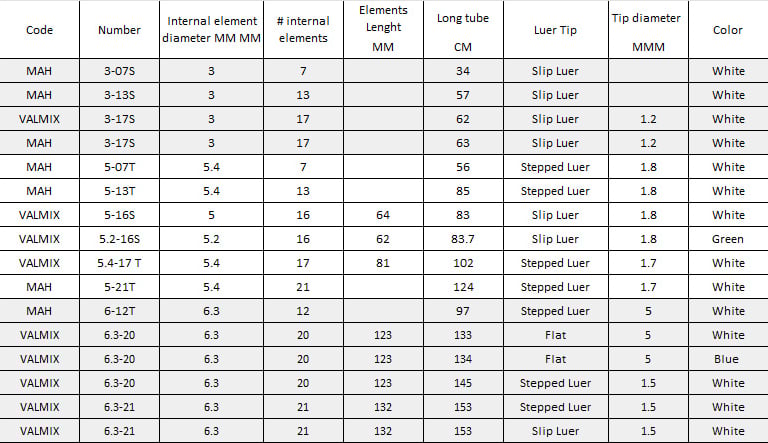 Below is a table with the standardized measurements of which we have different brands such as Val-Mix, Stamixco, Medimix/Sulzer Mixpac and Stato-Mix (MCH, ME, etc.), among others. Please feel free to ask for other special measurements.