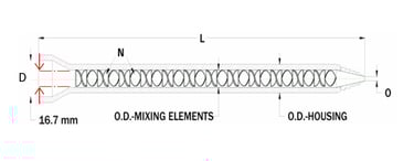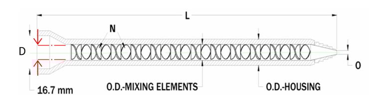 Typical drawing of disposable static mixer, with standard size bell of 16.7 mm diameter.