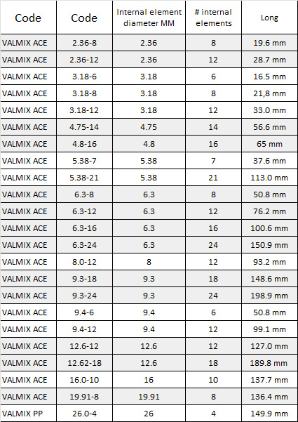 First the helical internal element are shown and then the GX and others, the tables are classified by the type of connection. Sometimes covers or nozzles are used with these mixers to provide safety during high pressure supply and also to prevent the plastic housing from "expanding" during operation.